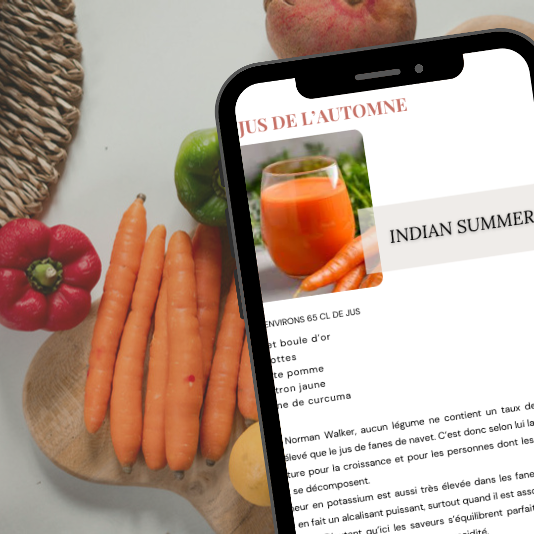 🔸 Un paragraphe explicatif sur les bienfaits de chaque jus + une note instructive sur un ingrédient spécifique à chaque recette ;